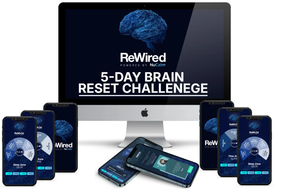 The ReWir3d 5-Day Brain Reset Challenge is a guided neuroscience experience created to help people calm their nervous system, improve sleep, and regain mental clarity.